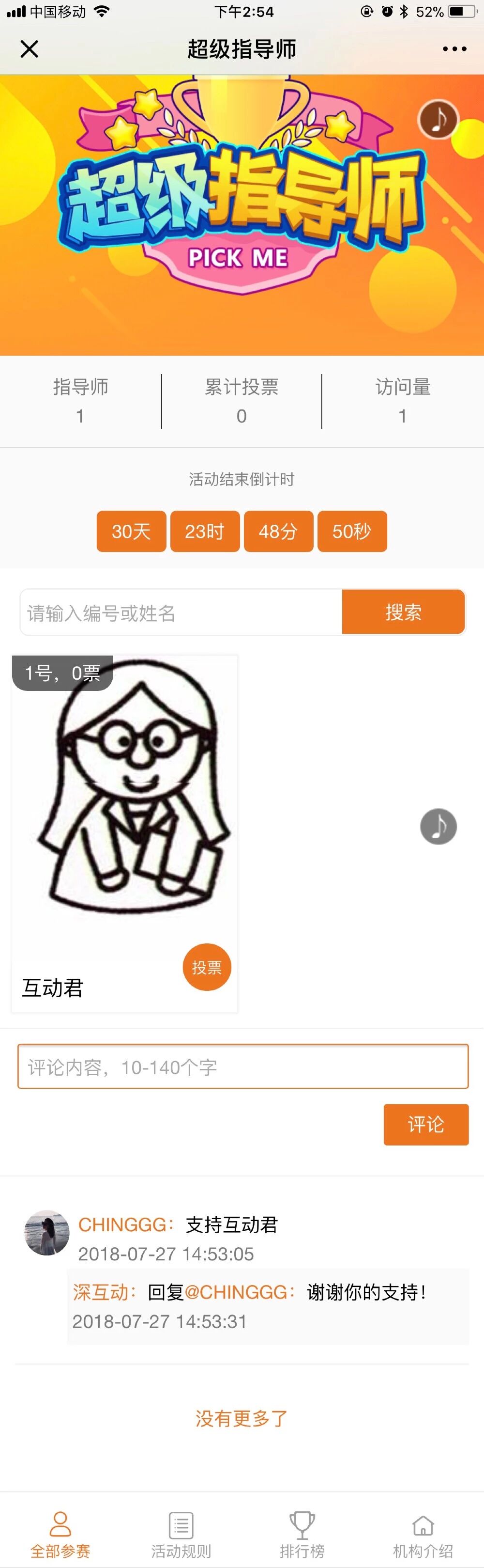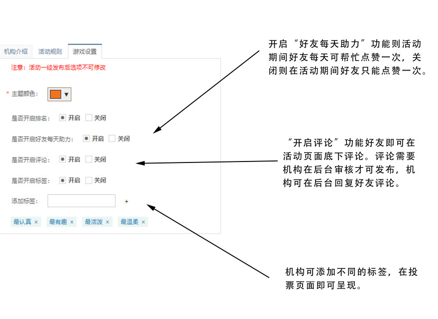 --------------------------------------- 1、机构在后台完成游戏设置后,保存即可开展活动; 2、页面跳转后可添加参赛者的个人信息,添加完毕后点击按成并预览; 3、点击发布活动即可开始! --------------------------------------- 1.通用设置:可以自定义页面标题,图标,活动开始及结束时间,也可以自定义背景和背景音乐。还可以开启引导关注和分享,设置分享文字等等。 2、游戏设置: (点击图片放大更清晰哦) --------------------------------------- 1、可展示机构的师资力量,达到品牌宣传的目的性; 2、活动可直观看到老师的教学态度,增加家长和老师的粘度; 3、此模块没有收集名单的功能,所以更利于用来内部评选,如:优秀员工、最美老师…… 4、替换背景图,结合节点或热点,如:pick最美军装老师。