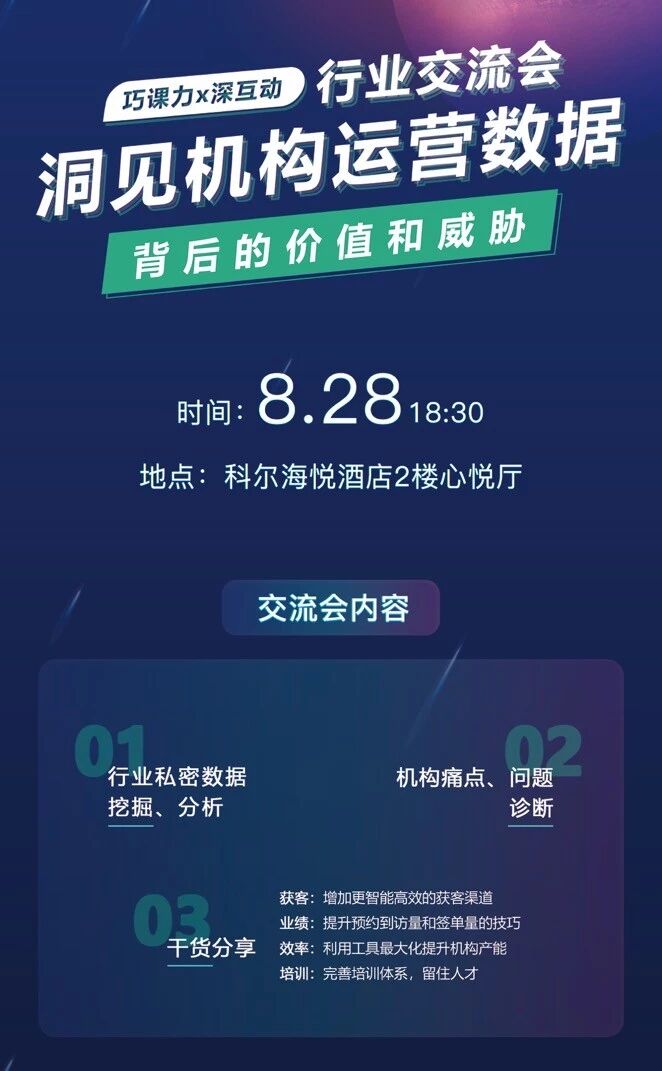 2018年8月28日,广州站「数聚进化论」教培行业交流会,巧课力CMO何湃和深互动CEO陈俊明将以“洞见机构运营数据背后的价值与威胁”为主线带来详细专业的数据化管理的方法!在此之前,本文将对教培机构数据化管理的思路做出简单分享,内容具有一定参考意义,推荐你花3分钟认真阅读。