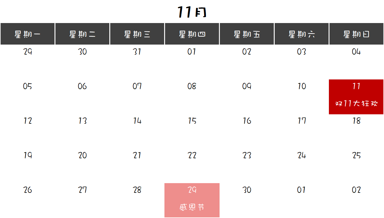 11月可以说是“折扣主题”大月,前有双11,全民营销。后有感恩节,可以做周年庆会员感恩回馈...