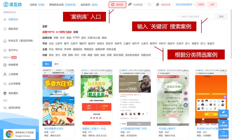 以上,是多家新开机构/中心持续复用的经典活动方案,除此之外,微团购、让红包变大等更多开业案例,登录「深互动」后台,于「案例库」中均可查看参考。