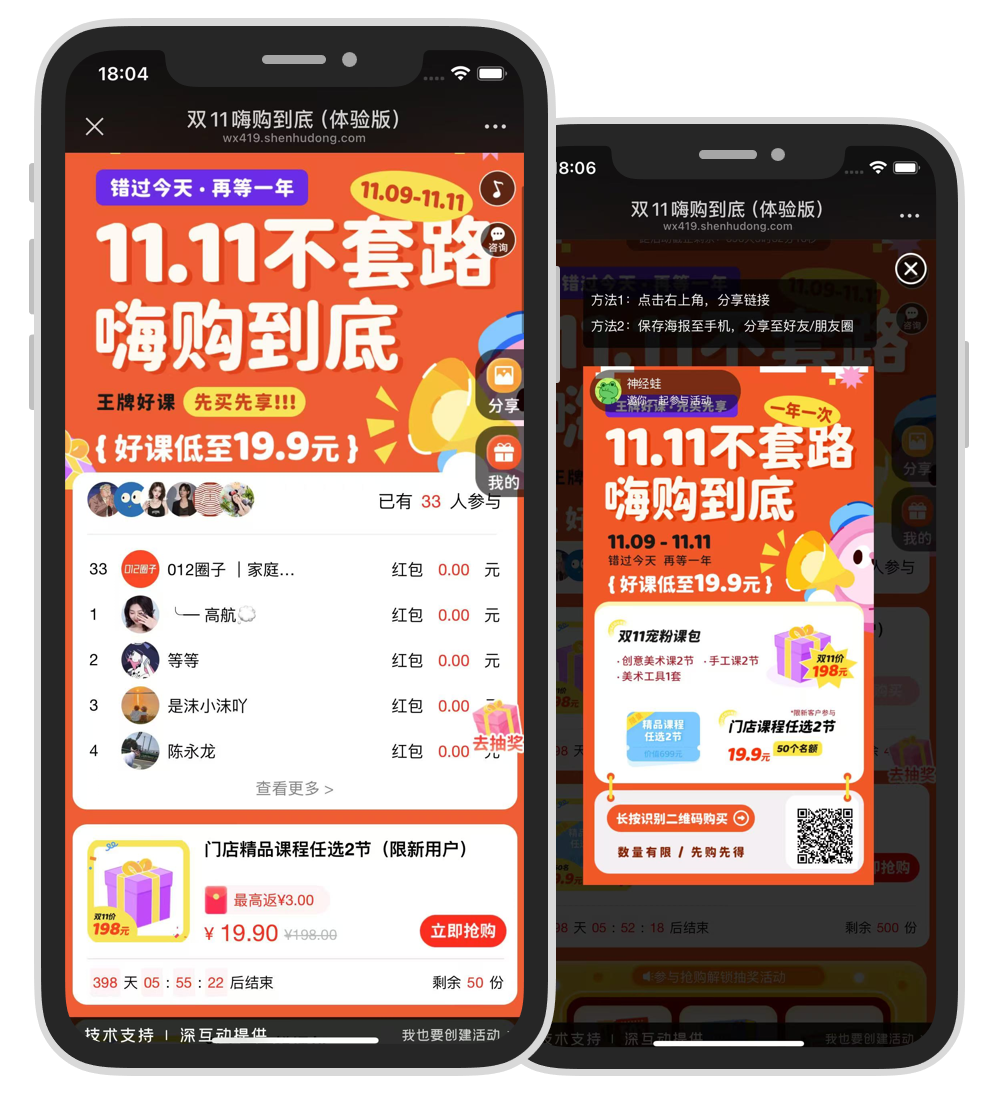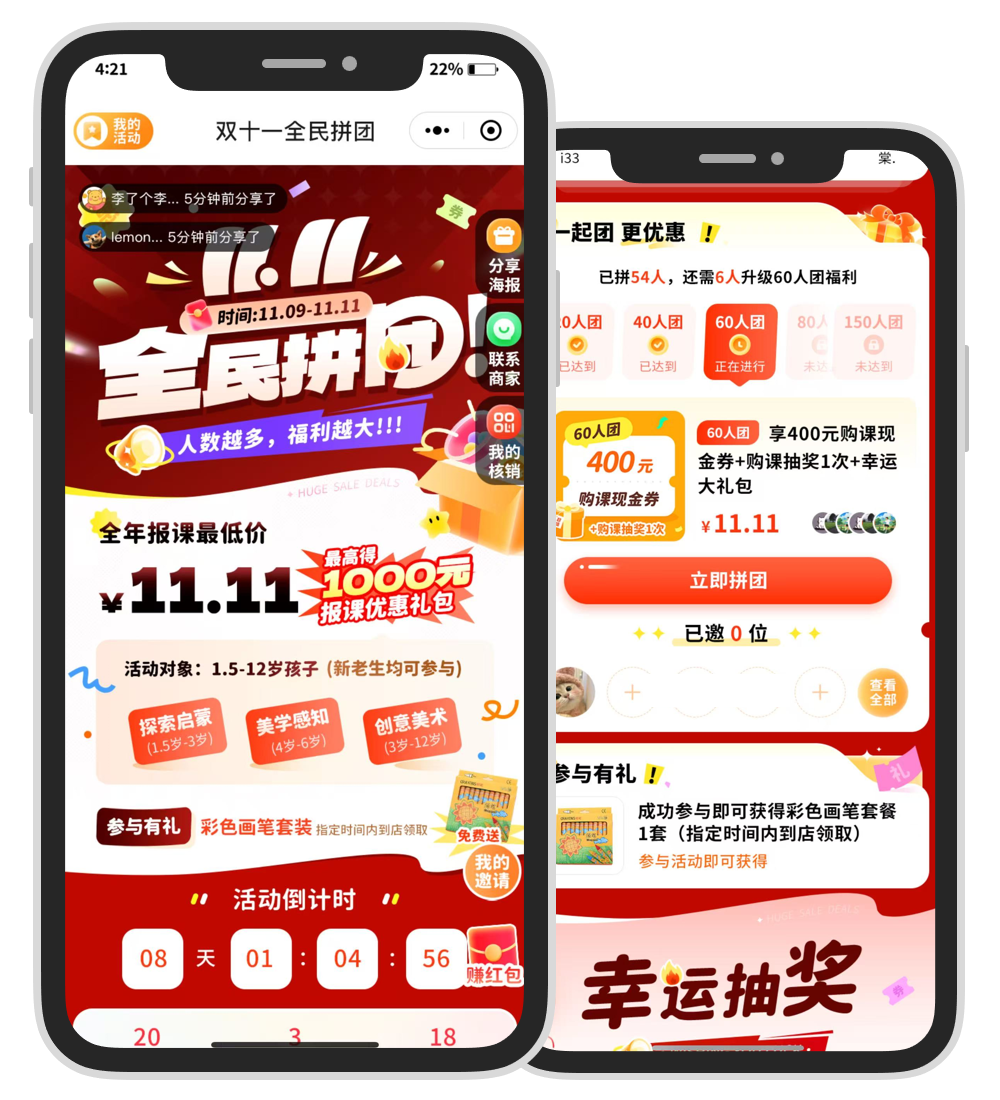 双十一节点,结合机构校区购课优惠政策,分不同阶段、不同目的展开线上活动,给大家推荐匹配的活动方案如下: