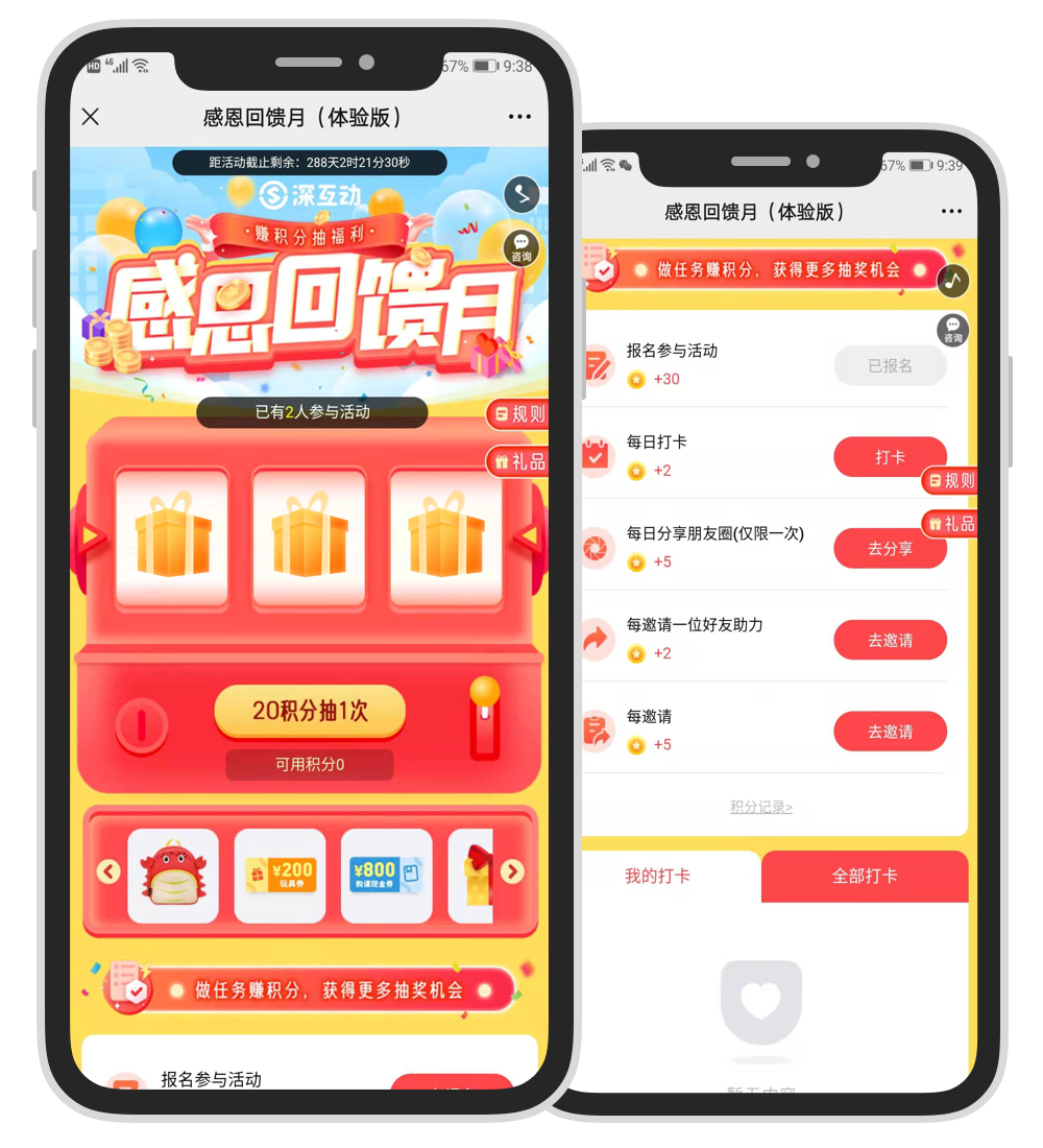 用户报名(并支付)参与活动 》 完成任务获得积分(包括报名积分、每日打卡积分、分享朋友圈积分、邀请好友助力积分、邀请好友参与积分) 》使用获得的积分参与抽奖,中奖到店兑奖