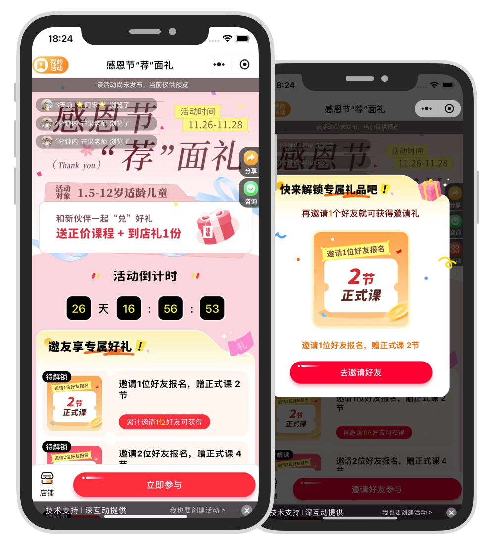 用户报名(支付)获得参与礼 》生成自己的专属海报分享,邀请好友参与 》邀请好友数量达到要求,可获得相应的邀请礼 》到店兑奖